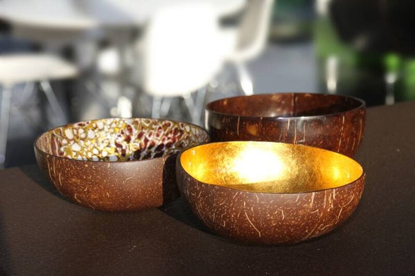Gerecycleerde kokosnootschalen voorzien van een leuk kleuraccent aan de binnekant.